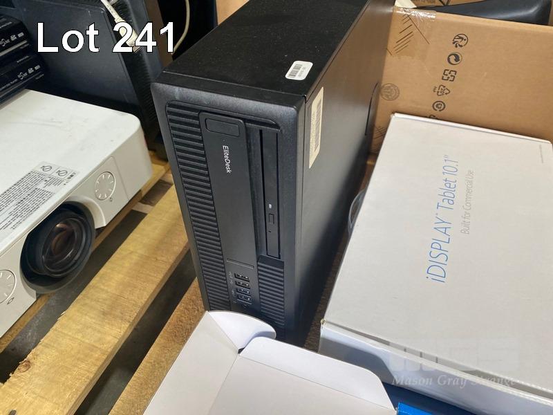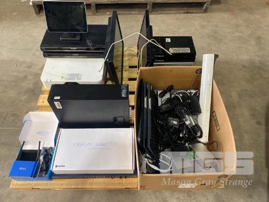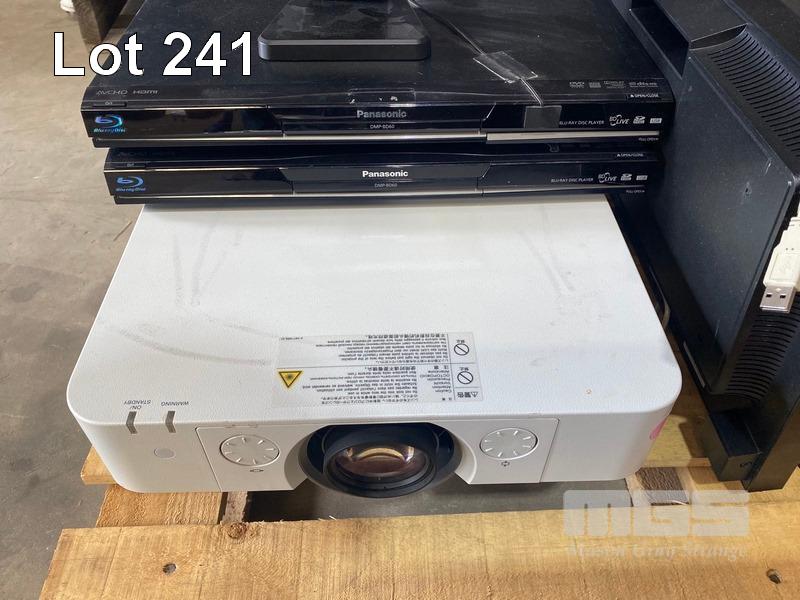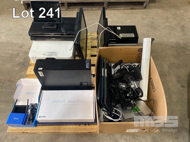 1 x PALLET LOT ASST A/V INC SONY PROJECTOR (FAULTY), PANASONIC BLU-RAY PLAYERS (NO REMOTES), HP ELITEDESK 800 G2 SFF PC (INCOMPLETE), ASST WIRELESS KEYBOARDS, MICE, iDISPLAY TABLET, ONELAN DIGITAL SIGNAGE PLAYERS (NO POWER SUPPLIES), 2 x LCD MONITORS, NETGEAR SWITCH