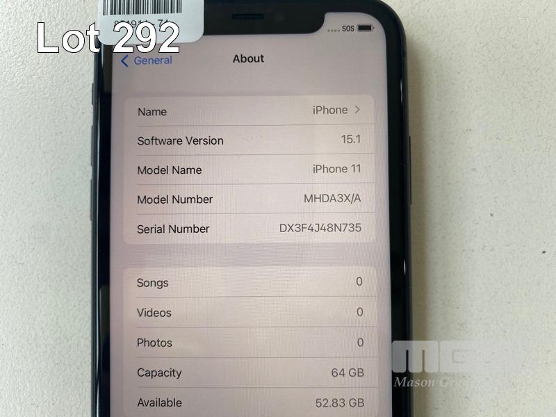 APPLE iPHONE 11, 64GB, BLACK, MODEL MHDA3X/A (NO CHARGER, NO CABLE) S/N:DX3F4J48N735