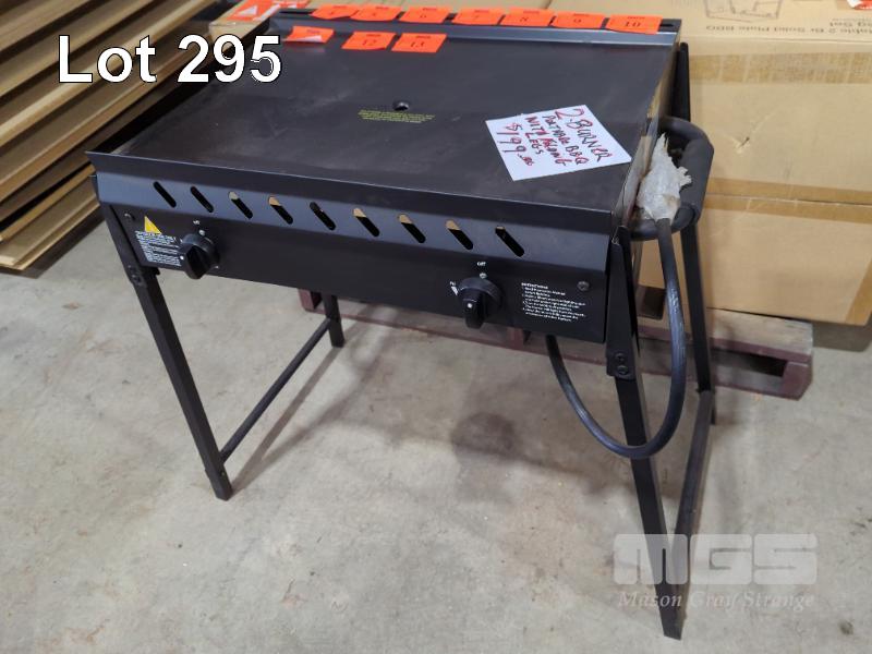 PORTABLE 2-BURNER SOLID PLATE GAS BBQ WITH FOLDING LEGS.