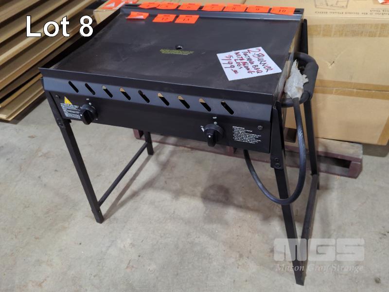 PORTABLE 2-BURNER SOLID PLATE GAS BBQ WITH FOLDING LEGS.
