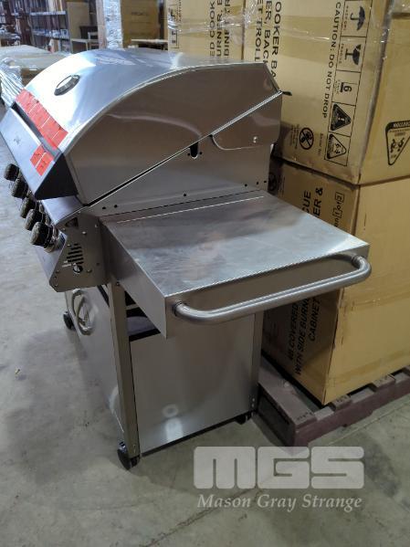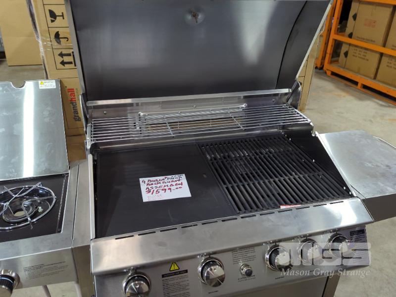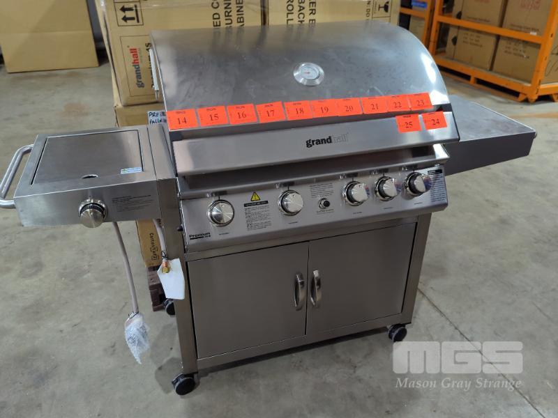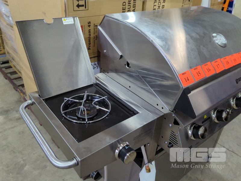 GRANDHALL PREMIUM 4S STAINLESS STEEL COVERED COOKER GAS BBQ 4-BURNER WITH SIDE BURNER, BACKBURNER & CABINET TROLLEY. NEW IN BOX (2 x BOXES). RRP $1,599
