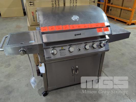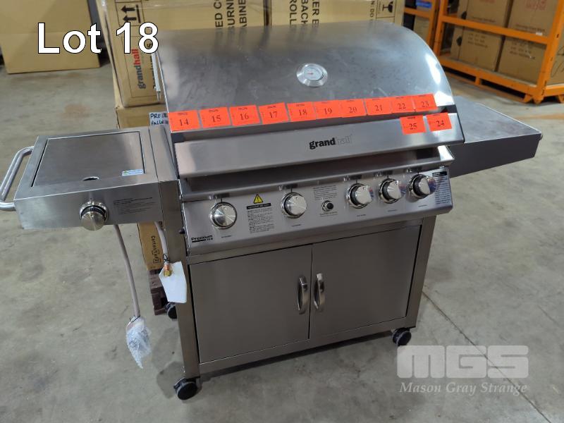 GRANDHALL PREMIUM 4S STAINLESS STEEL COVERED COOKER GAS BBQ 4-BURNER WITH SIDE BURNER, BACKBURNER & CABINET TROLLEY. NEW IN BOX (2 x BOXES). RRP $1,599