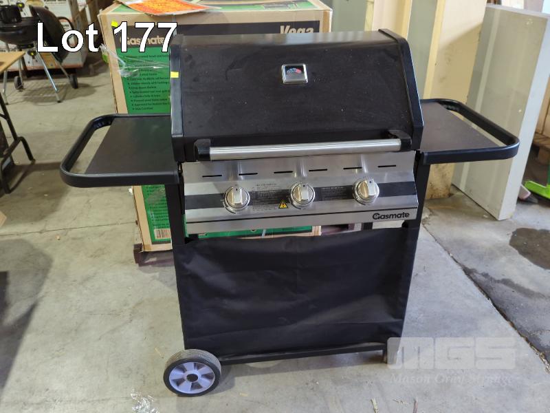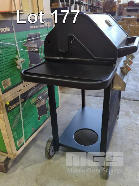 GASMATE VEGA MOBILE HOODED GAS BBQ. 3-BURNER IN VITREOUS ENAMEL WITH STAINLESS STEEL FASCIA. NEW IN BOX. RRP $399