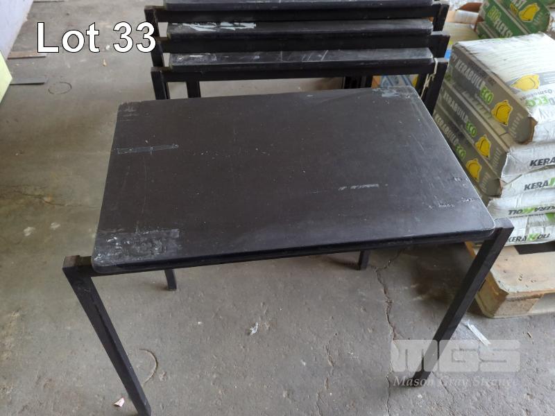 10 X STACKABLE EXAM DESKS - STEEL FRAME, LAMINATE TOPS ALL IN BLACK.