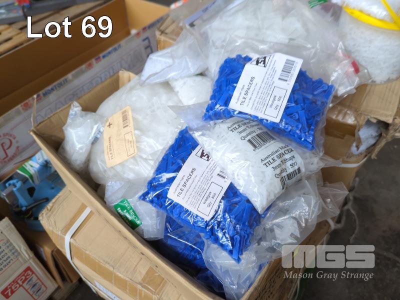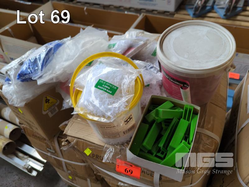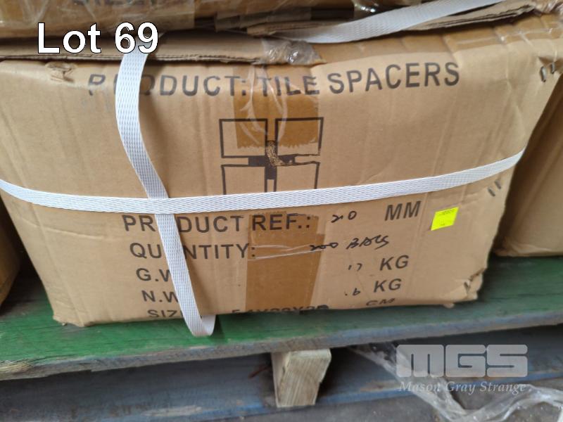 LARGE QUANTITY OF ASSORTED TILE SPACES COMPRISING CROSSES, WEDGES, T-SHAPES IN VARIOUS SIZES. INCLUDES 8 X BOXES 2 MM CROSSES AND BOX OF RECESSED PUDDLE FLANGES.