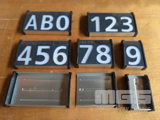 TRIO "SOLAR DIGITS" SOLAR HOUSE NUMBER SYSTEM. COMPRISING AS FOLLOWS. SOLAR HOUSE LETTER "A" - 1 X CARTON OF 80 PIECES. SOLAR HOUSE LETTER "B" - 5 X CARTONS OF 80 PIECES EACH. SOLAR HOUSE NUMBER "0" - 1 X CARTON OF 80 PIECES. SOLAR HOUSE NUMBER "1" - 1 X CARTON OF 80 PIECES. SOLAR HOUSE NUMBER "2" - 1 X CARTON OF 80 PIECES. SOLAR HOUSE NUMBER "3" - 1 X PART CARTON - HALF FULL. SOLAR HOUSE NUMBER "4" - 1 X CARTON OF 80 PIECES. SOLAR HOUSE NUMBER "5" - 1 X CARTON OF 80 PIECES. SOLAR HOUSE NUMBER "6" - 1.75 X CARTONS OF 80 PIECES EACH. SOLAR HOUSE NUMBER "7" - 1 X CARTON OF 80 PIECES + 3 X PACKS OF 5. SOLAR HOUSE NUMBER "8" - 1 X CARTON OF 80. SOLAR HOUSE NUMBER "9" - 3 X CARTONS OF 80 PIECES EACH. SINGLE DIGIT WALL MOUNTS - 3 X CARTONS OF 40 PIECES EACH. DOUBLE DIGIT WALL MOUNTS - 4 X CARTONS OF 40 PIECES EACH. TRIPLE DIGIT WALL MOUNTS - NONE