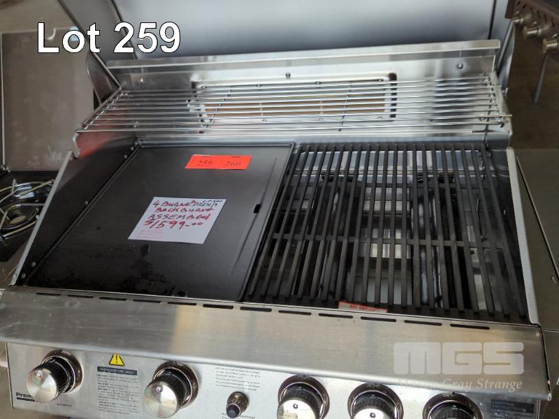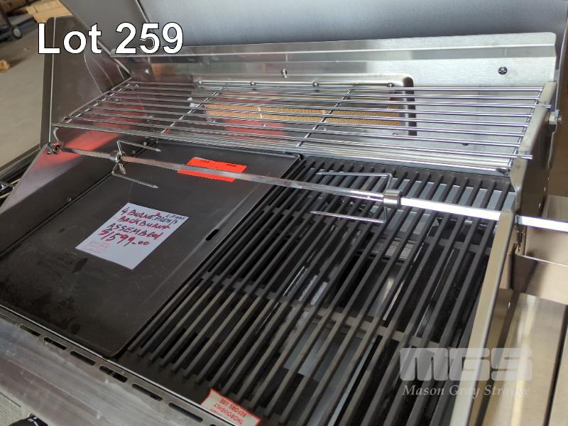 GRANDHALL PREMIUM 4S STAINLESS STEEL COVERED COOKER BBQ 4-BURNER WITH SIDE BURNER, BACKBURNER & CABINET TROLLEY. NEW IN BOX (2 x BOXES) RRP $1,599. WITH... ELECTRIC STAINLESS STEEL ROTISSERIE KIT 240V A.C. MOTOR 935 MM SPIT ROD, 2 X SKEWER FORKS, COLLAR, MOUNTING BRACKETS ETC. RRP $139