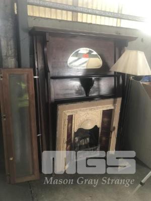 OLD SCHOOL OPEN FIREPLACE & TIMBER FIRE SURROUND, PEDESTAL LAMP & PAIR TIMBER GLASS DOORS