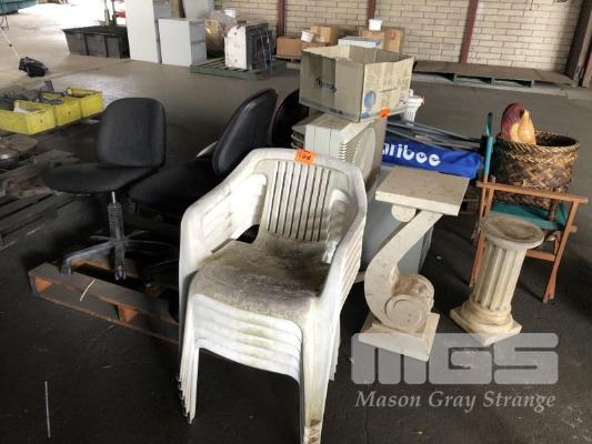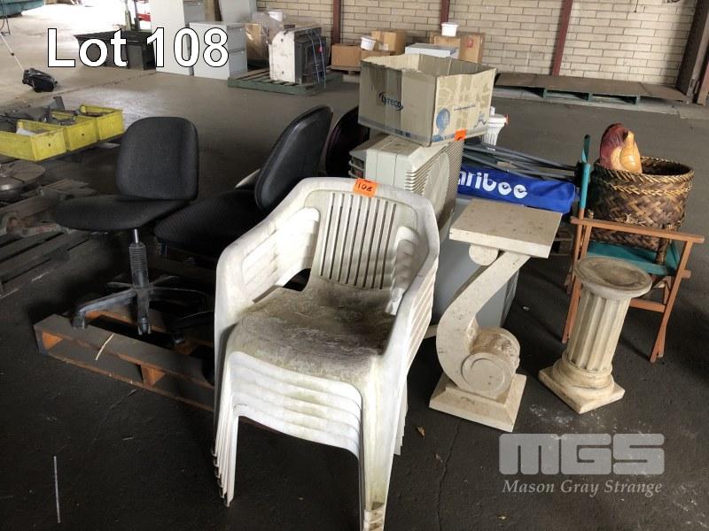 PLASTIC CHAIRS, OFFICE CHAIRS, WATER COOLER, 4 DRAWER STEEL CABINET, 2 x PEDESTALS & HOMEWARES