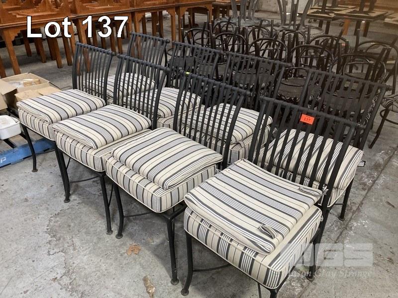 8 x OUTDOOR CHAIRS, BLACK STEEL FRAME WITH CUSHIONS