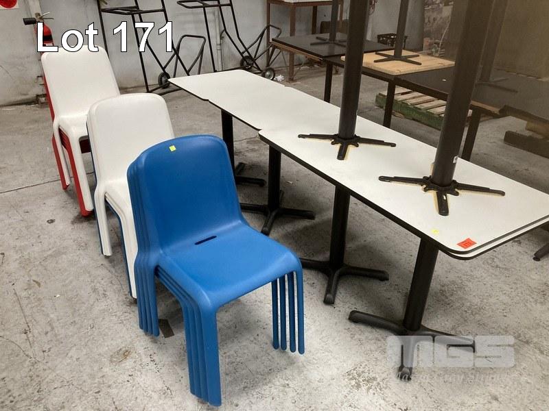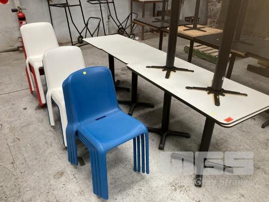 4 x CAFE TABLES, 2 @ 60 x 60cm & 2 @ 120 x 60cm 15 x PVC CHAIRS, ASSORTED COLOURS