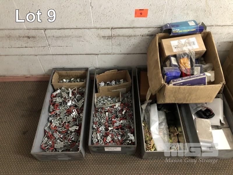 4 x STEEL TRAYS OF TRAILER LATCHES, BRACKETS, TRAILER LIGHT WIRING, LEDS, ETC.