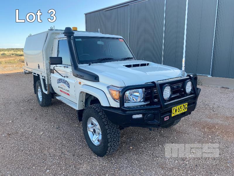 2019 TOYOTA LANDCRUISER GXL CAB CHASSIS 4x4 VIN: JTELV73J00B010555 ODO: 62,900kms 5 SPEED MANUAL TRANSMISSION, 4x4 ALLOY WHEELS, BULL BAR, FOG LAMPS, MOD: VDJ79R-TJMNYQ3 UHF RADIO REVERSE CAMERA SOLAR PANEL, PROJECTA 1800w INVERTER ENGEL FRIDGE REMOVABLE TRADESMAN TOOL BOX FITOUT 2 x SPARE WHEELS UPGRADED SUSPENSION REAR TRAY DRAWER WATER TANK TWO PACK (WITH PAPERS, WITH OWNER'S MANUAL, WITH SERVICE BOOKS)
