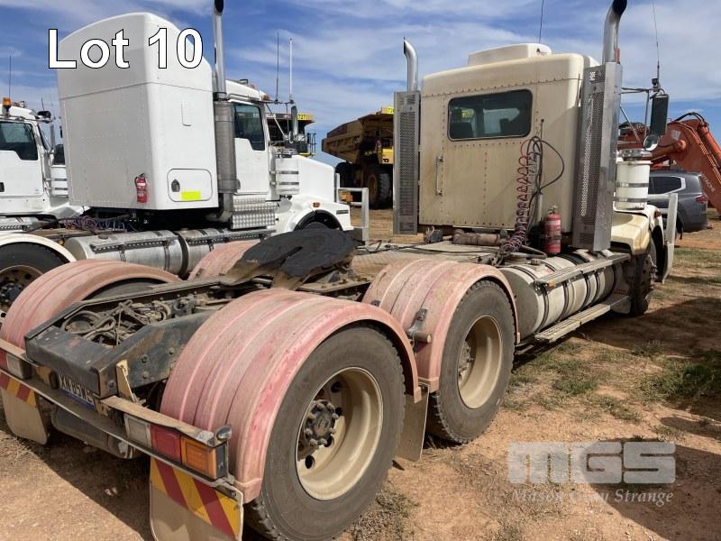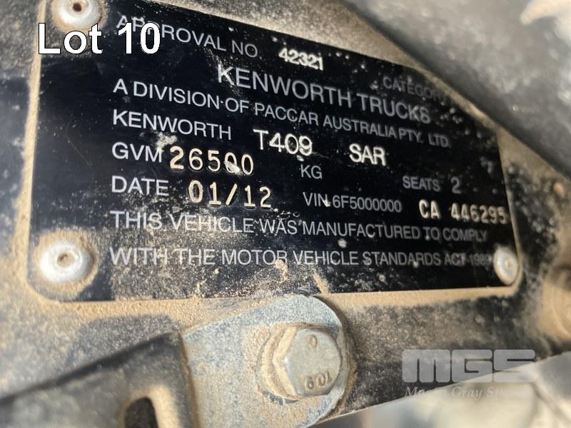 2012 KENWORTH T409 PRIME MOVER VIN: 6F5000000CA446295 HOURS: 26,855 CUMMINS ENGINE, AUTO LUBE, DAY CABIN, DPF, SIDE TIPPER HYDRAULICS 18 SPEED, AIR BAG SUSPENSION, 95T RATED, 50MM FIXED TURNTABLE