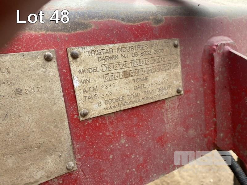 2017 TRISTAR TRIAXLE DOLLY VIN / CHASSIS: 6T9T23NT0H2NUM019 50MM FIXED TURNTABLE, AIR BAG SUSPENSION, BPW AXLES, R/T RATED, HYDRAULIC LINES FITTED