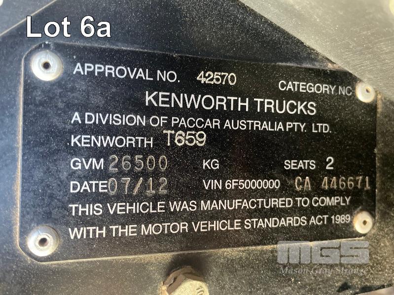 2012 KENWORTH T659 PRIME MOVER VIN: 6F5000000CA446671 ODO: 973,982KMS showing CUMMINS, 18 SPEED EATON SPEED TURBO DIESEL, AIRBAG SUSPENSION, TIPPER HYDRAULICS 50mm PIN VESTA BUNK, A/C ENGEL FRIDGE ALLOYS LOW RANGE FUEL TANKS WITH INTEGRATED OIL TANK (NO PAPERS, NO OWNER'S MANUAL, NO SERVICE BOOKS)