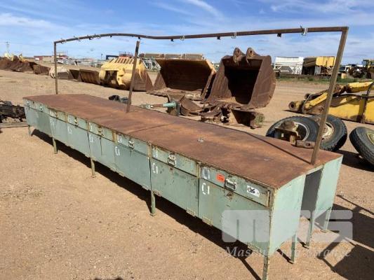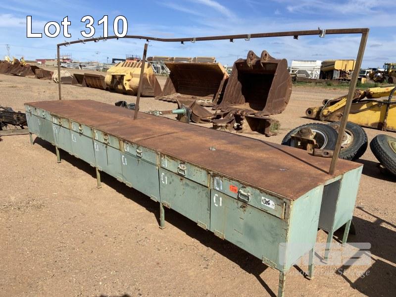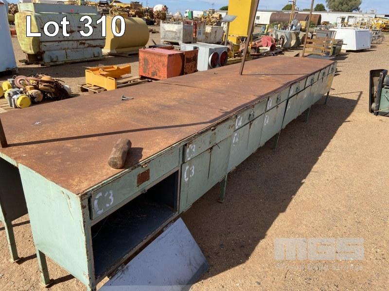 EX GOV WORKS BENCH, 16 DRAWER/DOOR STORAGE, PLATE STEEL TOP, 4500 x 1200mm
