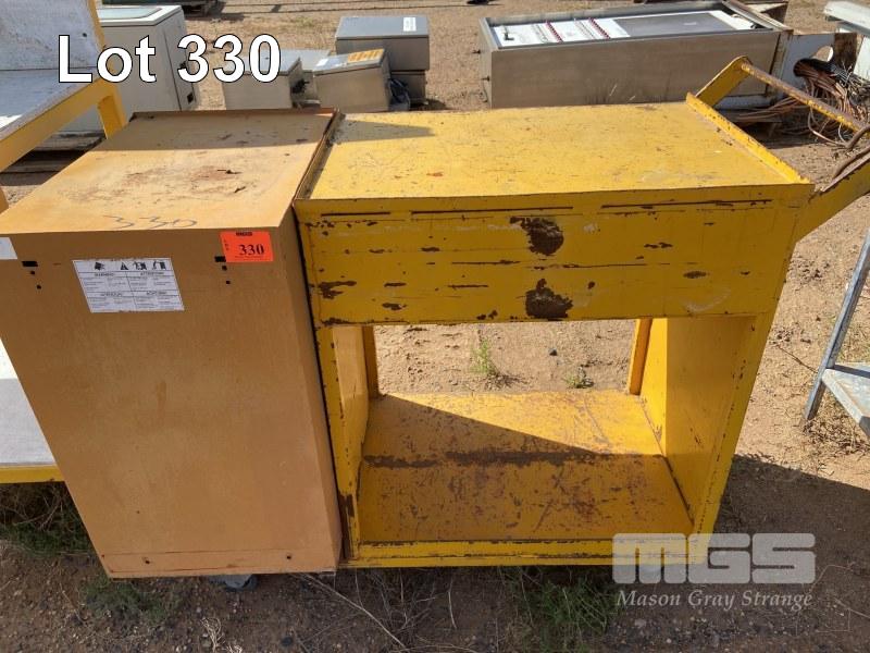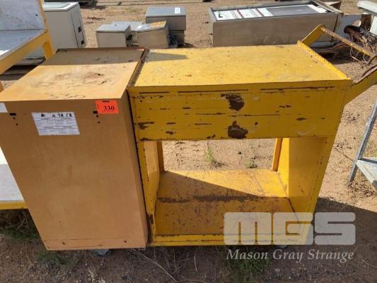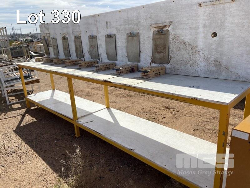 TUBE STEEL BENCH, 4200mm WITH BACKBOARD & TROLLEY, TOOL BOX, ETC