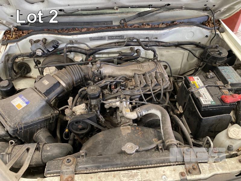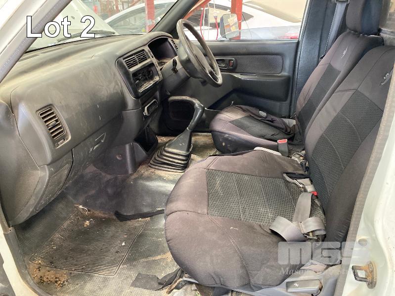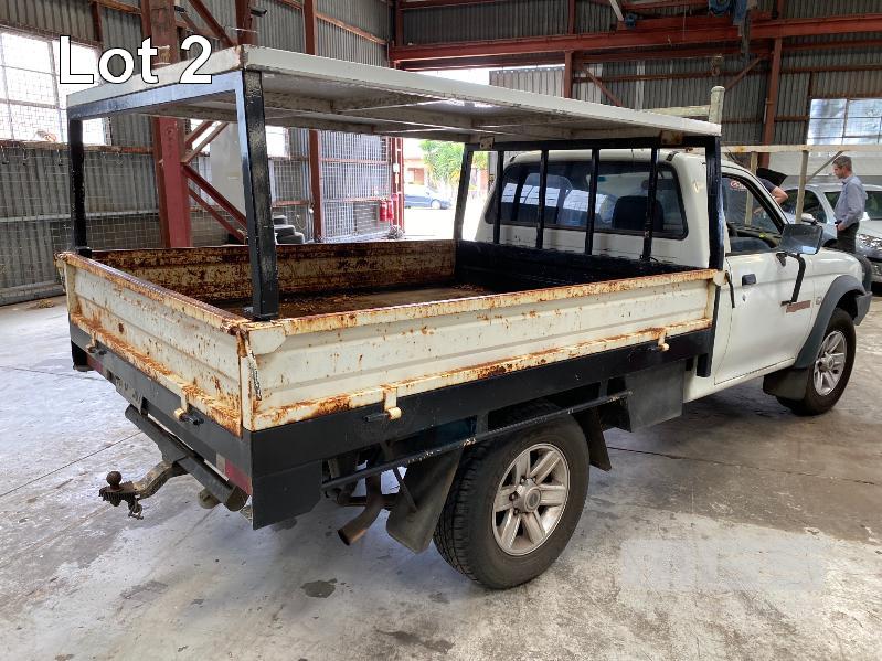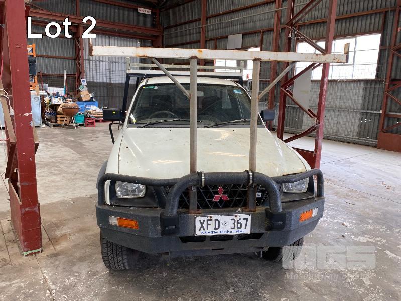 2002 MITSUBISHI MK TRITON GLX TRAYTOP REG: XFD 367 (SA) VIN: MMB0NK6603D013577 ODO: 195,600kms SHOWING 3.0 LITRE, V6 PETROL, 5 SPEED MANUAL TRANSMISSION, WHITE DUCO, 2 DOORS, 3 SEAT, AIR CON, ALLOY WHEELS, BULL BAR, LADDER RACK, SPARE WHEEL, TOW BAR, FITTED WITH STEEL UTE CANOPY WITH REGO PAPERS (WITH PAPERS, WITH 1 KEY/S)