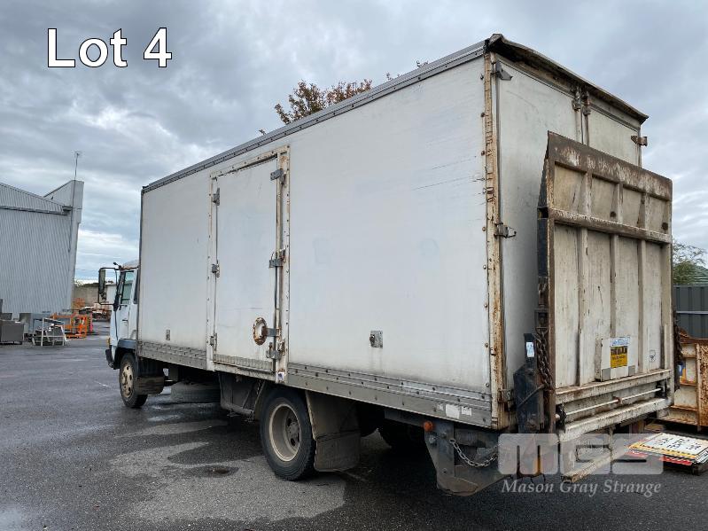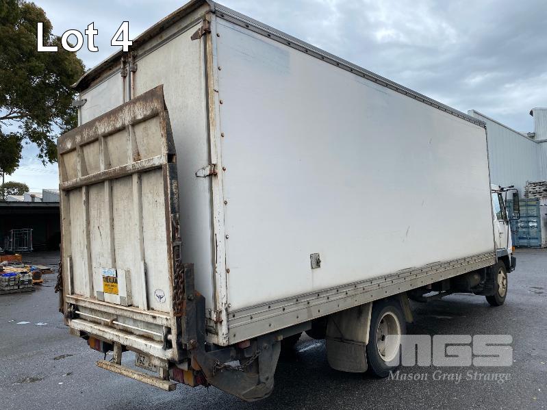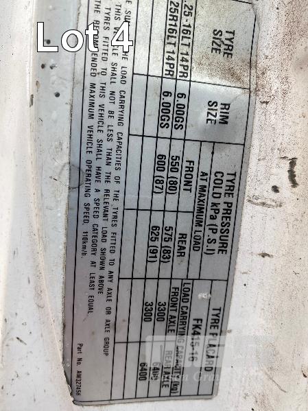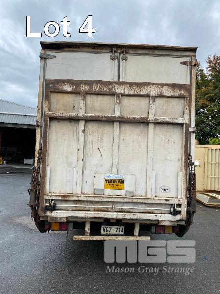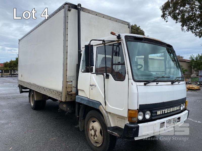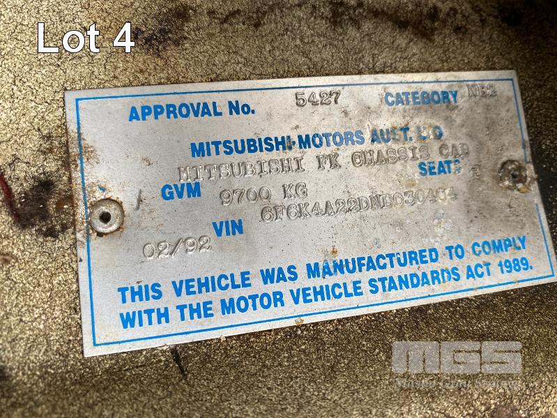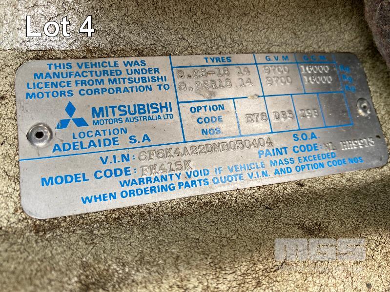 1992 MITSUBISHI FK415K 4x2 SINGLE CAB PANTEC REG: VGZ 214 (SA) VIN: 6F6K4A22DNB030404 ODO: 551,154kms SHOWING GVM: 9,700kg GCM: 16,000kg LENGTH: 6400mm WIDTH: 2400mm 6 CYLINDER, DIESEL, 5 SPEED MANUAL TRANSMISSION, SPRING SUSPENSION, WHITE DUCO, 3 SEAT, AIR CON, STEEL RIMS, TIEMAN TAIL GATE LOADER, 1,000kg CAPACITY WITH PENDANT CONTROL REAR DOUBLE DOORS & LARGE SIDE DOOR SPARE WHEEL, DUAL REAR WHEELS, 8.25R20 KEY #11 (WITH PAPERS, WITH 2 KEY/S)
