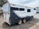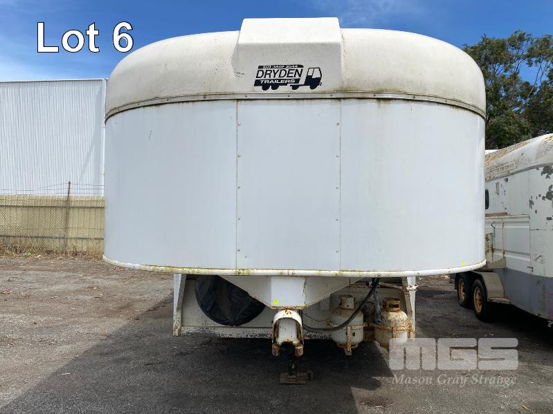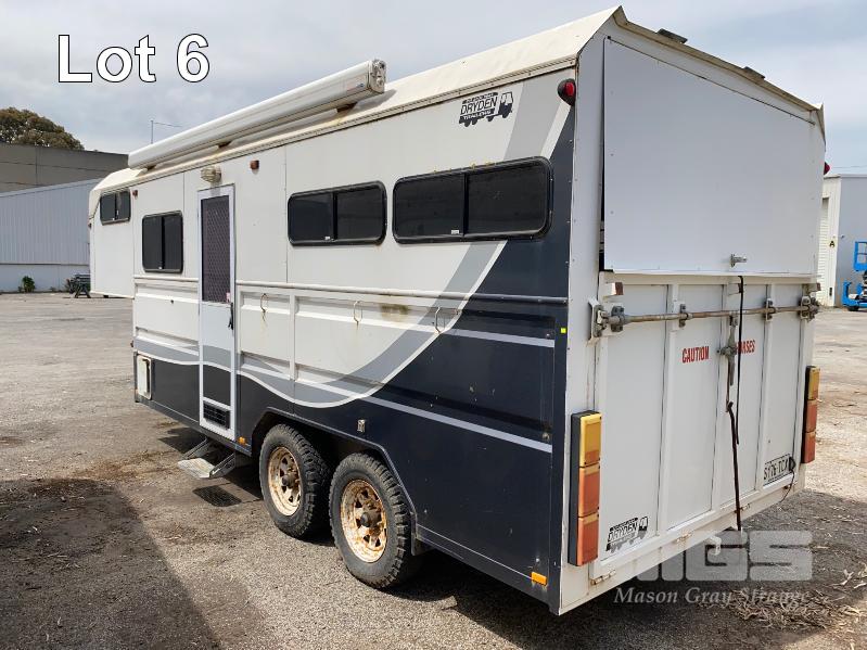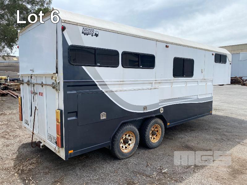 2003 DRYDEN TRAILERS TANDEM AXLE HORSE FLOAT MODEL: 25FT GOOSENECK REG: S176 TCX VIN / CHASSIS: 6T9T27ABA30BAM002 SIZE : 25 x 8ft (7600 x 2480mm) 3 HORSE ANGLED STALLS WHITE & BLACK BALL HITCH, ELECTRIC BRAKES WITH BRAKE AWAY EMERGANCY BRAKING SYSTEM, LIVING QUARTERS, FULLY PARTITIONED FROM HORSE STORAGE WITH ACCESS DOOR FULL KITCHEN, DINING & 3 PERSON SLEEPING QUARTERS, POWER & LIGHTING, INTERNAL & EXTERNAL HEAPS OF STORAGE SPACE, HANGING CUPBOARDS, UNDER SEAT STORAGE, OUTSIDE LOCKABLE STORAGE COMPARTMENT BELLY WATER TANK WITH 12V PUMP, REAR UTILITY SHOWER, PULL OUT AWNING, EXTERNAL TIE POINTS CCTV CAMERA FOR HORSE COMPARTMENT REMOVABLE HORSE STALLS WITH HEAD DIVIDERS, BRIDLE & SADDLE STORAGE RACKS MASS: 3,000kg GTM: 4,500kg WITH REGO PAPERS & KEYS KEY #25 (WITH PAPERS)