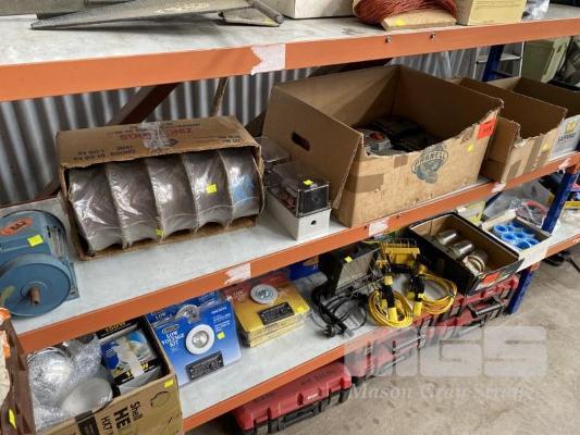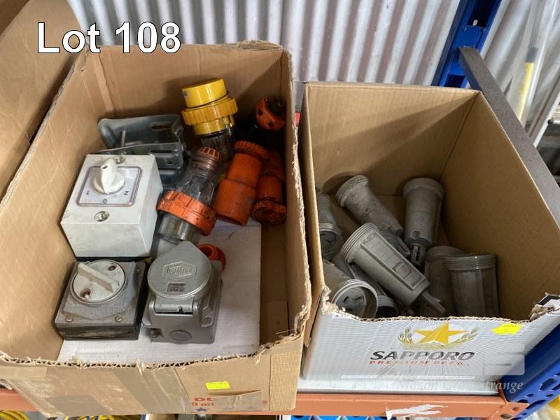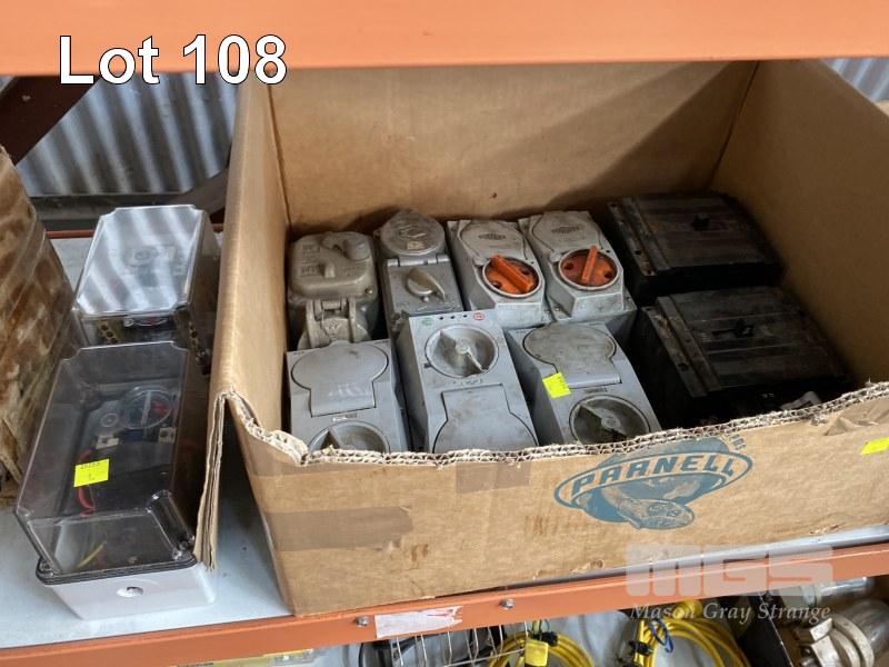 415V & 240V GPO OUTLETS, PLUGS, SOCKETS, SWITCHES, BREAKERS, 2 x WATTMASTER TIMING SWITCHES, 5 x ROLLS SINGLE CORE ELEC WIRE, 10mm & ELECTRIC MOTOR