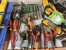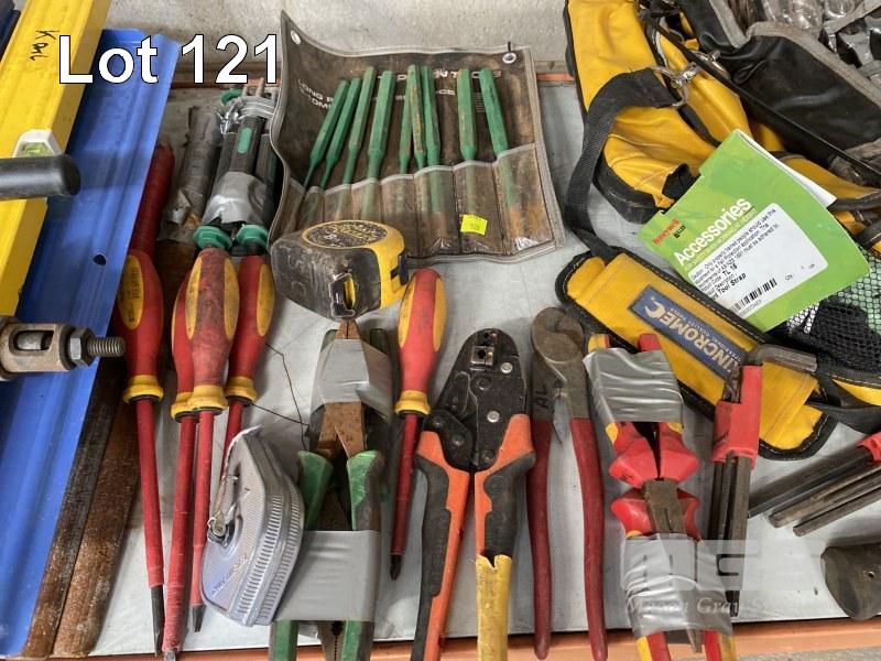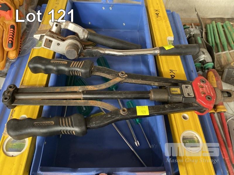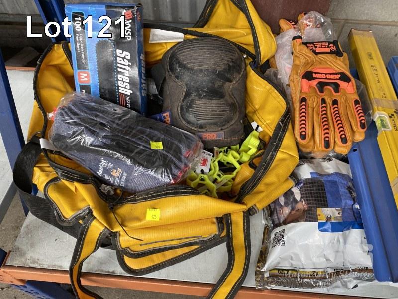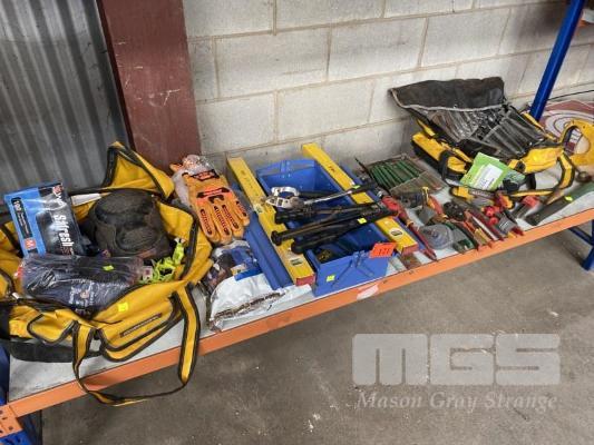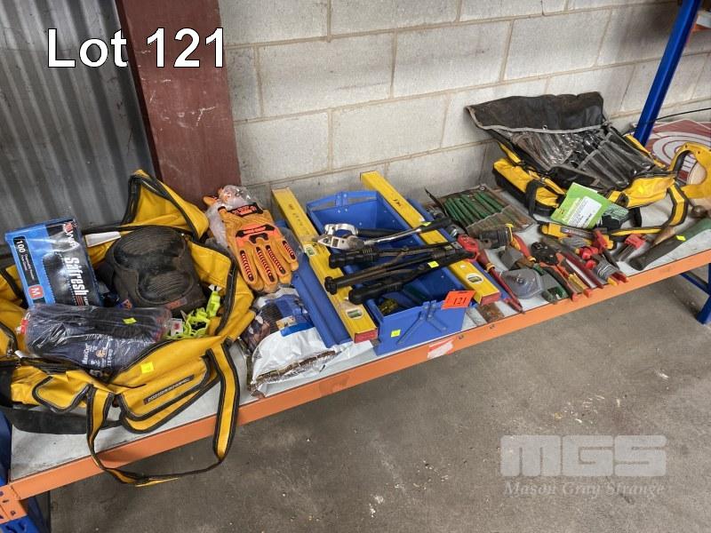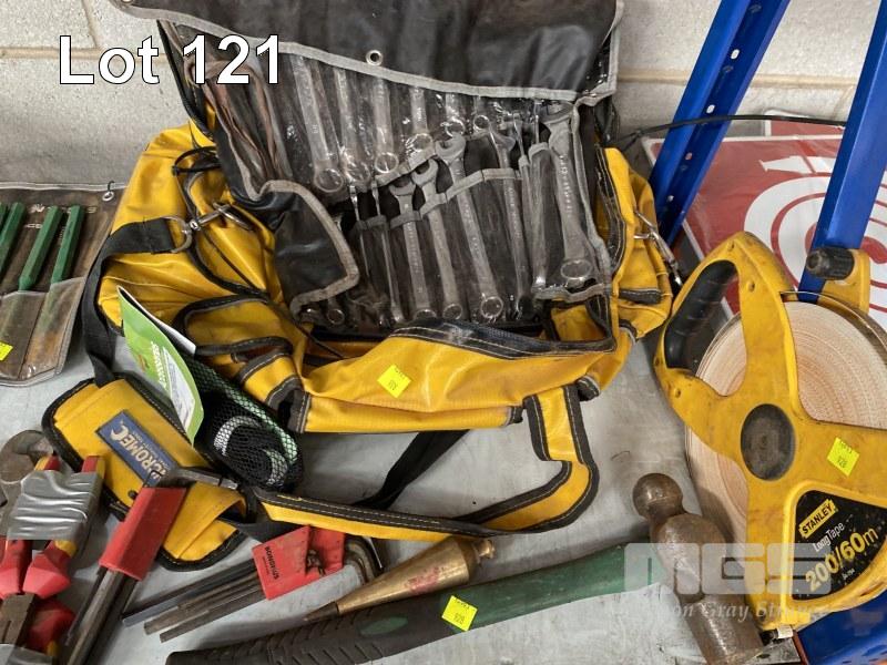 STEEL STRAP TENSIONER, NUTSERT TOOL, ASSORTED HAND TOOLS, 22 PIECES COMBO SPANNER SET, TOOLBOX, GLOVES, ETC, 1 x SHELF