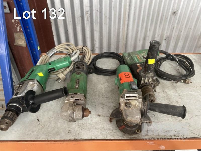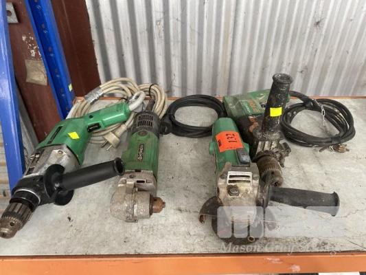 2 x HITACHI HAMMER DRILLS, ANGLE GRINDER & RIGHT ANGLE DRILL, 240V