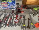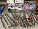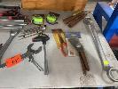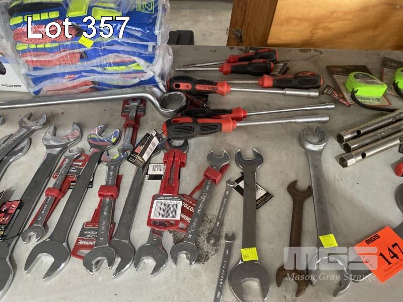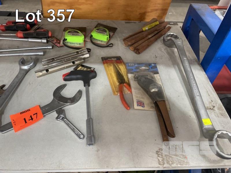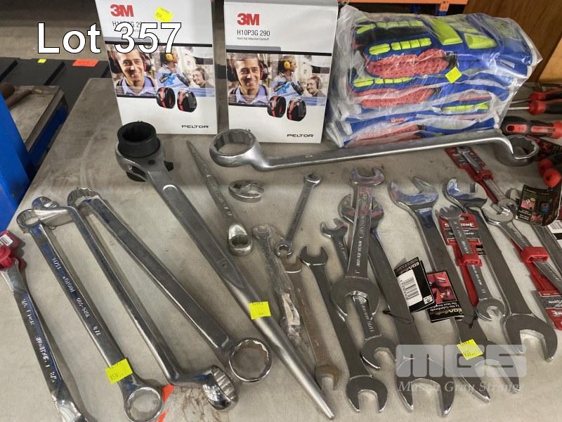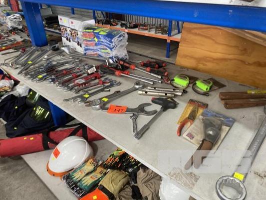 QUANTITY ASSORTED HAND TOOLS, SIDCHROME, ETC INC OPEN END & RING SPANNERS, 41 TO 6mm, HEX DRIVERS, PIPE WRENCH, RATCHET SPANNER, 36mm, TAPE MEASURES, 10 x PAIRS HIGH VIS RIGGERS GLOVES & 2 x 3m PELTOR HELMET EAR MUFFS 1 x SHELF