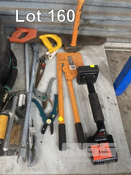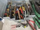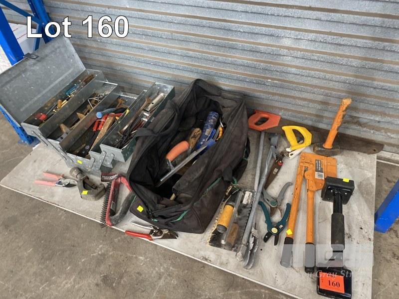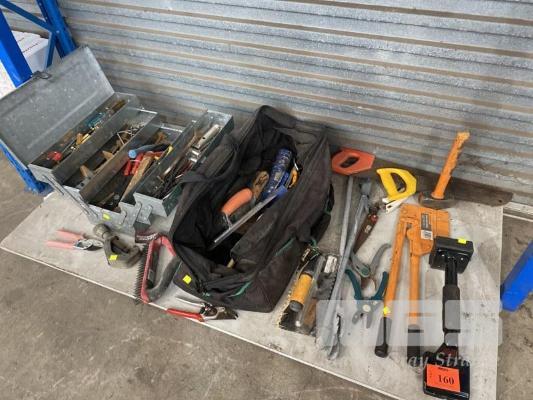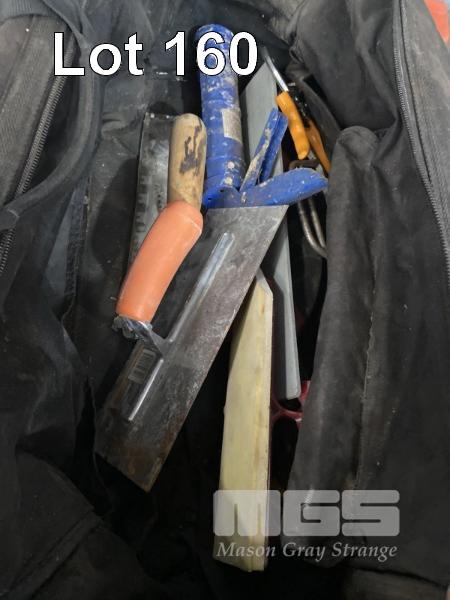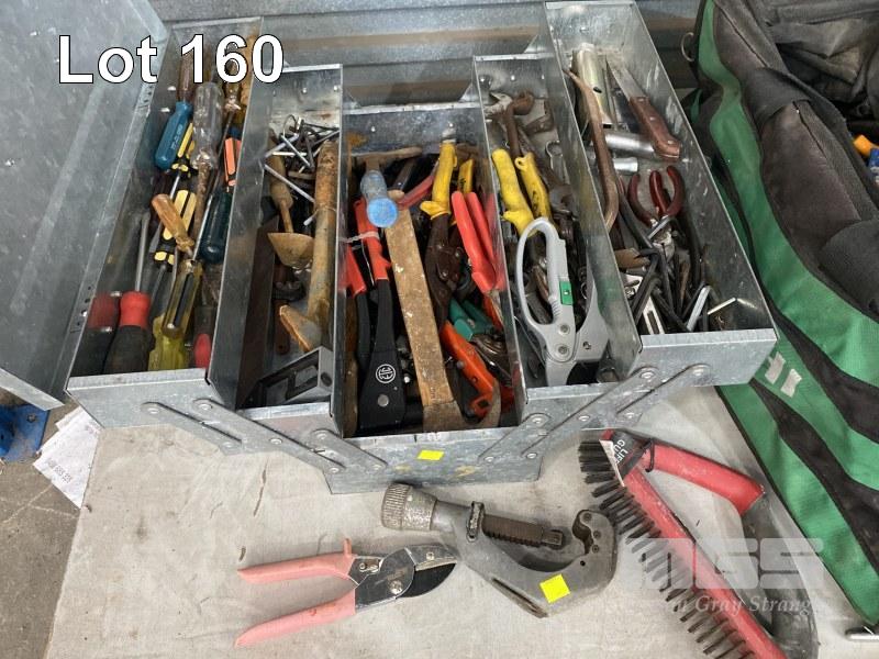TOOL BOX & BAG WITH ASSORTED HAND TOOLS INC TILE CUTTER, RIVETER, CONCRETE TOOLS, ETC, 1 x SHELF