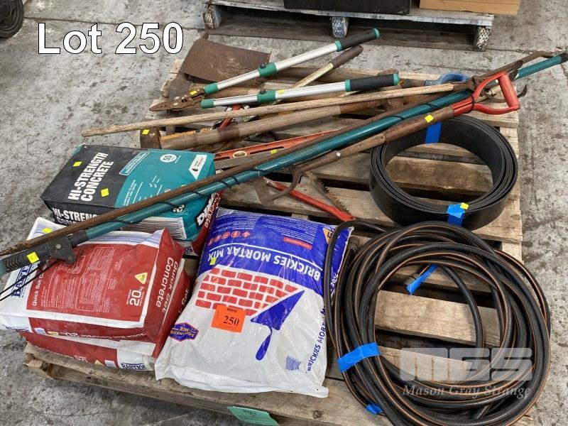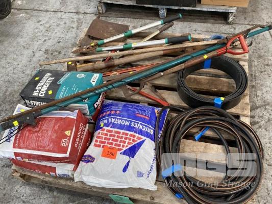 3 x BAGS QUICK SET CONCRETE, 1 x BAG HIGH STRENGTH CONCRETE & 1 x BAG BRICK MORTAR MN, WOOD BREAKER AXE, GARDEN SHEARS, SHOVEL, PICK, HOSE, ETC