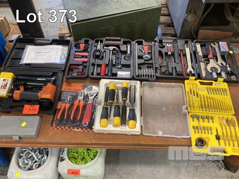 ASSORTED HAND TOOLS, DRILL BIT SET, CHISEL SET, ETC