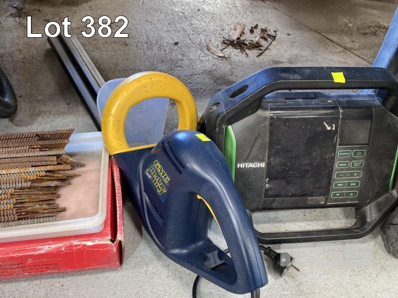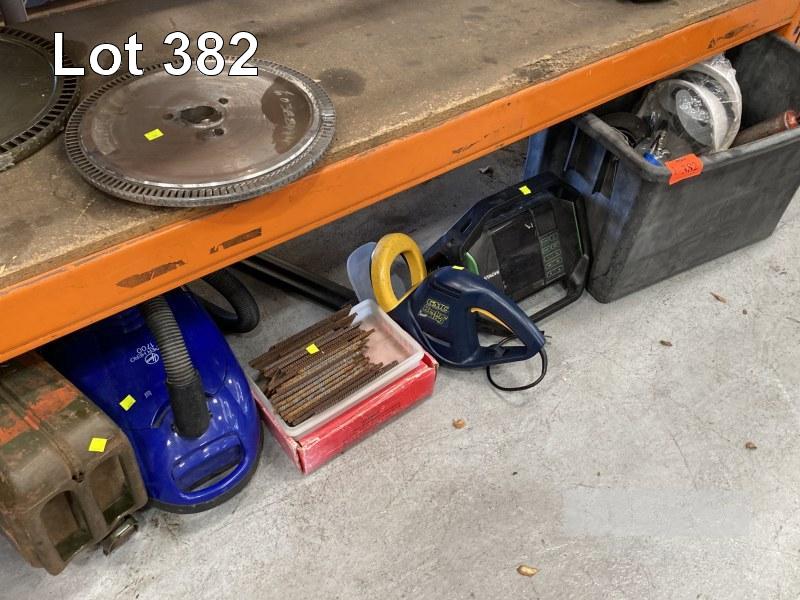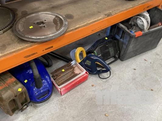 MAKITA HAMMER DRILL, GMS HEDGE TRIMMER, GREASE GUN, SWITCHES, VACUUM CLEANER, JERRY CAN, ETC