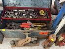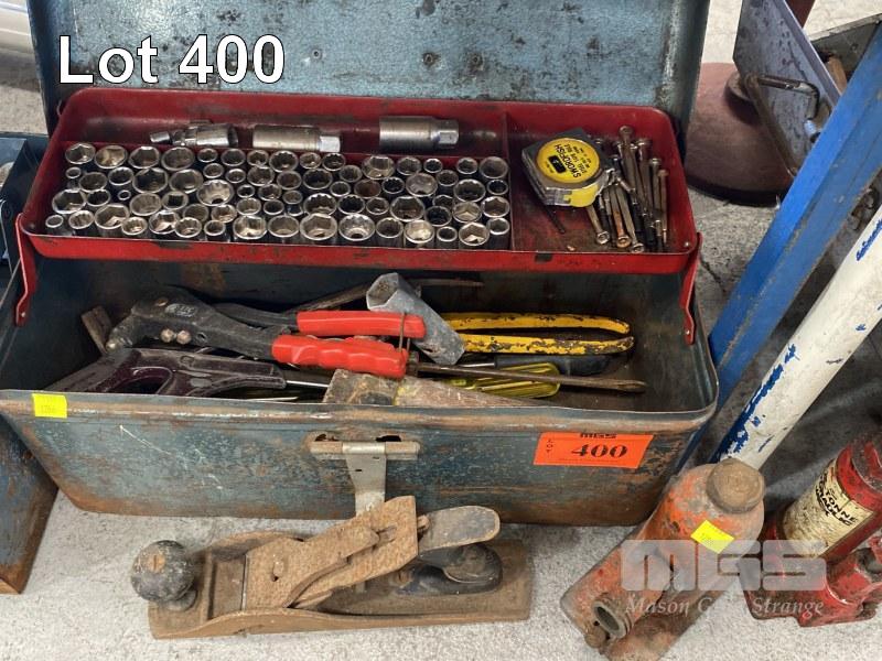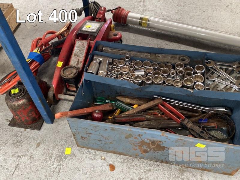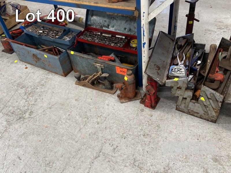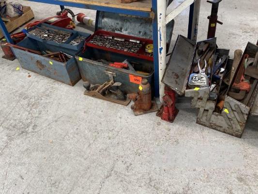 3 x TOOL BOXES & CONTENTS, ASST HAND TOOLS, SOCKETS, SPANNERS, 3 x BOTTLE JACKS, PAIR CHASSIS STANDS, JUMPER LEADS, ETC