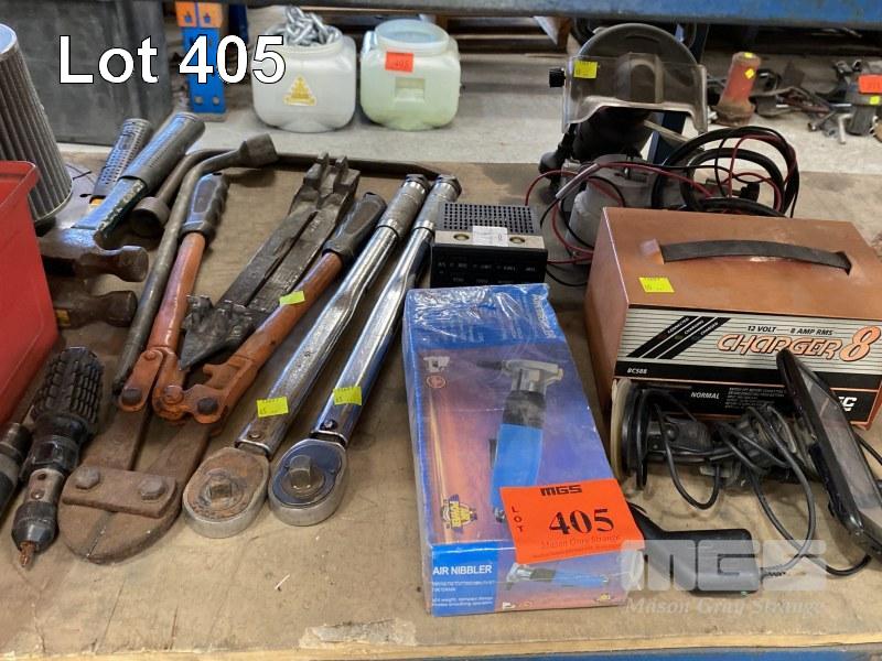 AIR POWER NIBBLER, (AS NEW), HAND TOOLS INC SOCKETS, SPANNERS, BOLT CUTTERS, 2 x RATCHET TORQUE WRENCHES, NAVMAN GPS UNIT WITH HOLDER, ARLEC BATTERY CHARGER, EXTENSION LEADS & DRILL BIT SHARPENER, 240V