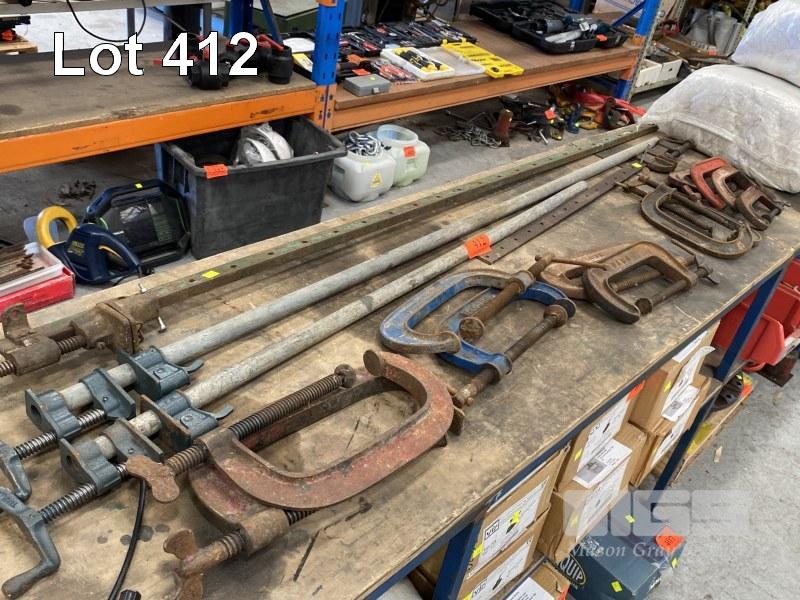 12 x ASSORTED G-CLAMPS UP TO 300mm & 4 x SLIDING SASH CLAMPS, 1800, 1600, 1200 & 900mm