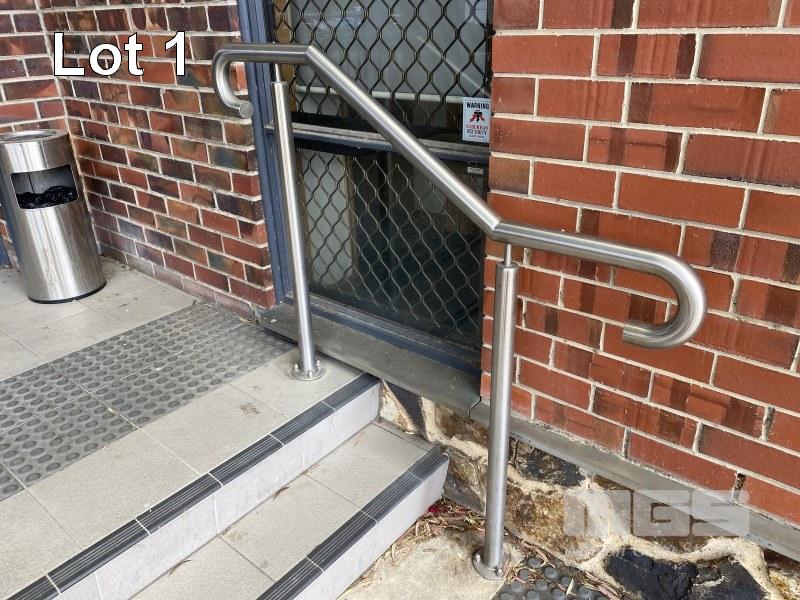 STAINLESS STEEL HAND RAIL, SUIT WHEEL CHAIR RAMP COMPRISING OF 23m TOP RAIL, 21m BOTTOM FLAT BAR, 24 x 1m UPRIGHTS ALL NON MAGNETIC STAINLESS STEEL (BUYER TO DISMANTLE)