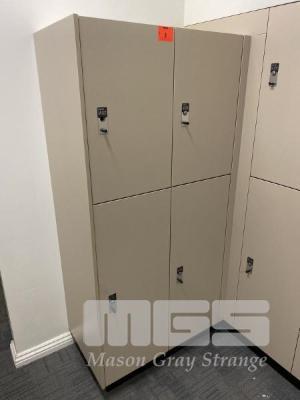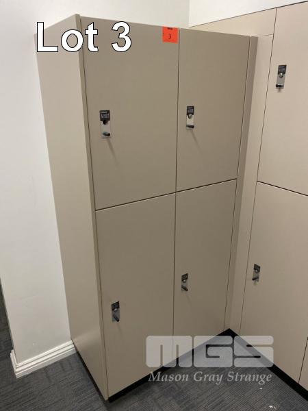 INTERLOC TIMBER LAMINATE KEY OPERATED LOCKERS, TOP & BOTTOM LOCKER SETS TOP LOCKER: 400 x 660 x 470mm BOTTOM LOCKER: 400 x 1000 x 470mm 4 x LOCKERS TOTAL WITH KEYS (ONE LOCK MISSING)