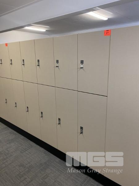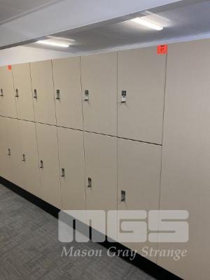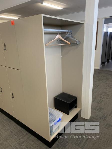 INTERLOC TIMBER LAMINATE KEY OPERATED LOCKERS, TOP & BOTTOM LOCKER SETS TOP LOCKER: 400 x 660 x 470mm BOTTOM LOCKER: 400 x 1000 x 470mm 10 x LOCKERS TOTAL WITH KEYS PLUS MATCHING COAT STORAGE, 1000 x 1800mm