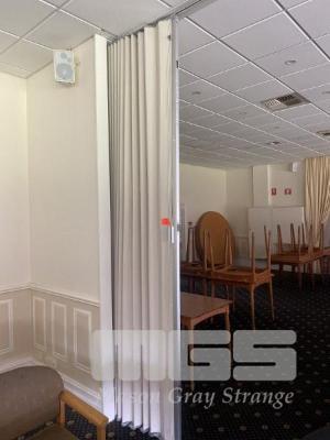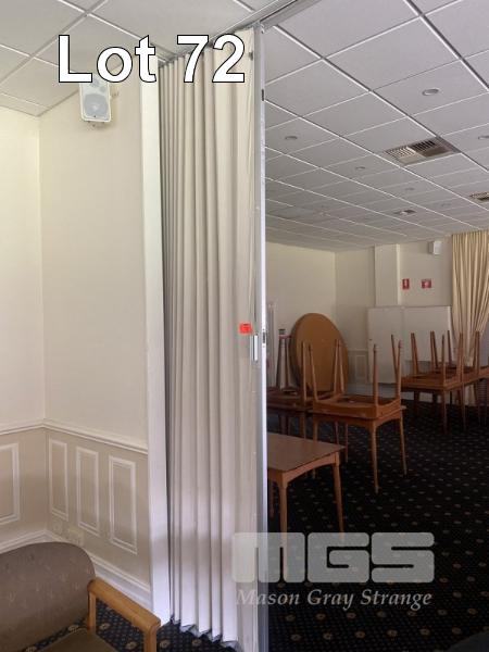 2 x HUFCOR CONCERTINA DIVIDING WALLS, BEIGE, 3200mm (H) x 5200mm (L) WITH TOP RAILS & BRACKETS (ONE DAMAGED)