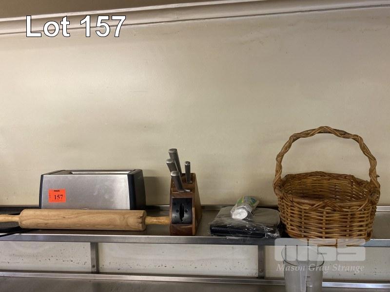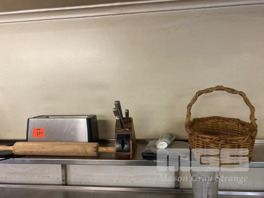 HOME KITCHEN SET, TOASTER, KETTLE, WILTSHIRE KNIFE SET, 2 x PICNIC BASKETS, GARBAGE BAGS, TEA/COFFEE TINS, ROLLING PIN, ETC.