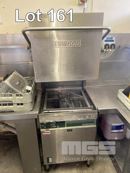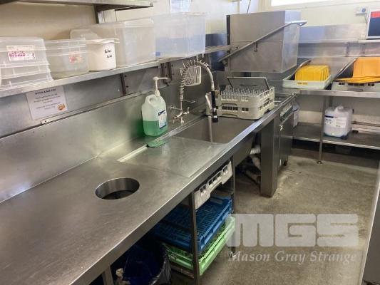 COMPLETE KITCHEN WASH STATION COMPRISING ESWOOD COMMERCIAL DISHWASHER, MODEL: ES-32, 415v WITH CHEMFORM SYSTEM STAINLESS STEEL INFEED BENCH 3500 x 730mm,WITH DEEP BOWL SINK, HOT/COLD DISH RINSING TAP, DISH WASHER TRAY STORAGE L SHAPE OUT FEED STAINLESS STEEL BENCH 1870 x 630mm, 2 TIER 3 x STAINLESS STEEL DRYING RACKS