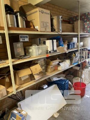 4 x SHELVES OF ASSORTED BASEMENT TREASURES, GLASS WARE, COFFEE MACHINES, COFFEE CUPS, 2 x THERMOS, PAINT SUPPLIES, HOT WATER DISPENSER ETC.