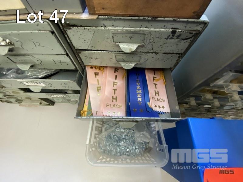 LARGE QUANTITY OF ENGRAVING HARDWARE, INCLUDES TROPHY LABELS & BADGES, WITH MULTI DRAW STORAGE UNIT