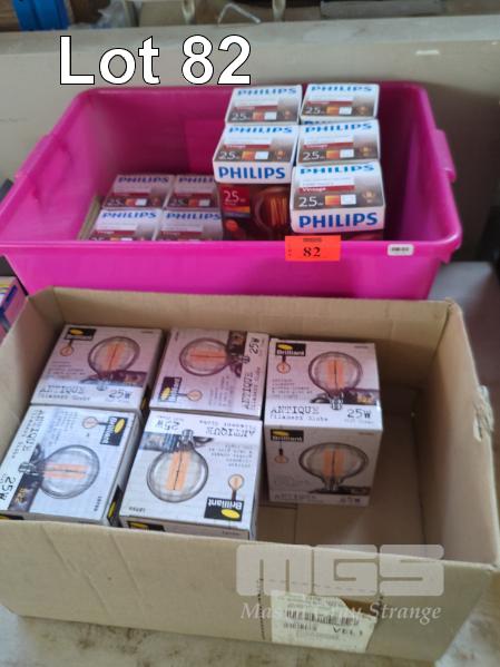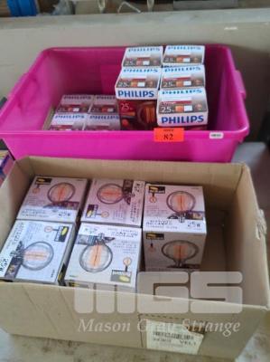 QUANTITY OF FESTOON LIGHT GLOBES - B22 BAYONET FILAMENT GLOBES COMPRISING: 5 X BRILLIANT "ANTIQUE" - 25W/G125 CLEAR (MODEL 18759). 17 X PHILLIPS "VINTAGE" - 25W/60LM/G95/DIMMABLE/CLEAR/WARM WHITE. ( 1 X TUB, 1 X BOX)