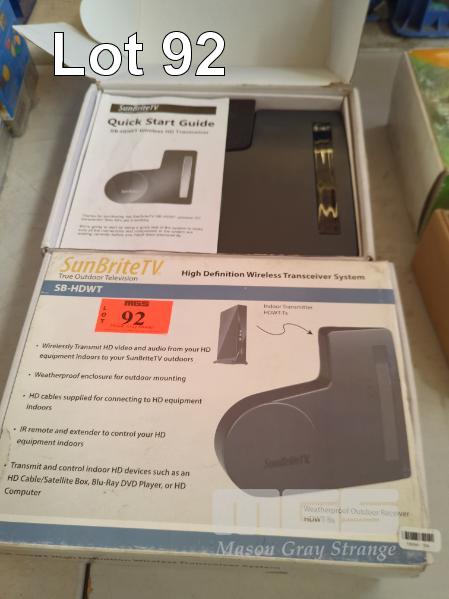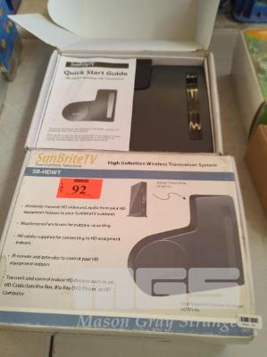 2 X SUNBRITE TV HIGH DEFINITION WIRELESS VIDEO TRANSCEIVER SYSTEM (SB-HDWT). INDOOR TRANSMITTER AND WEATHERPROOF OUTDOOR RECEIVER, IR REMOTE + IR EXTENDET AND HD CABLES INCLUDED. ALL NEW IN BOX.