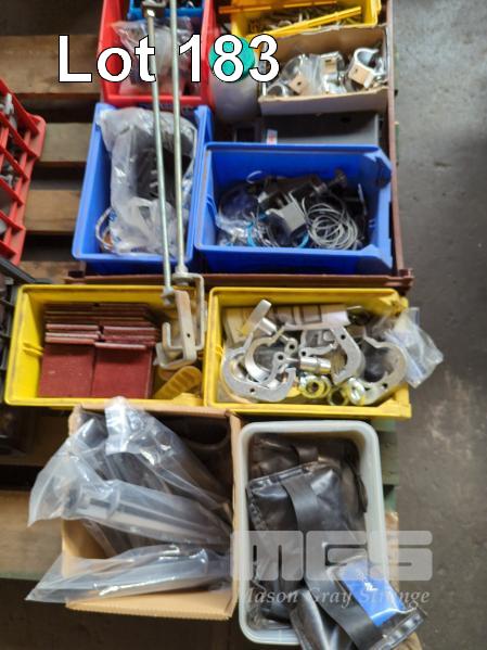ASSORTED STAGE TRUSS & OTHER ACCESSORIES INCLUDING COUPLERS, BRACKETS, BALLAST BAGS, CATENERY WIRE AND CHAIN, BOLTS, SPIKES, CARPET SQUARES ETC (1 X PALLET)
