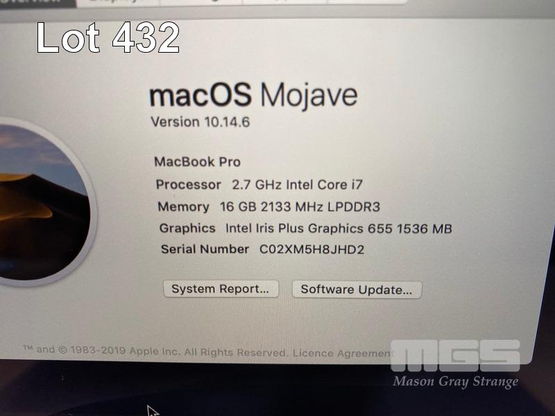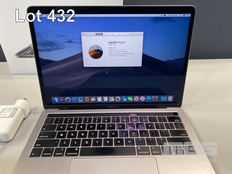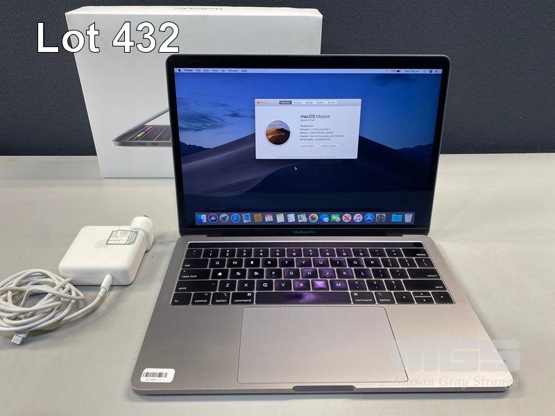 LAPTOP, APPLE MACBOOK PRO (A1989), CORE i7 8559U (8TH GEN) @ 2.7GHz, 16GB DDR3 RAM, 256GB SSD, 13.3" WIDESCREEN (2560x1600), INTEL IRIS PLUS GRAPHICS 655, Wi-Fi, TOUCH BAR, MAC OS 10.14 INSTALLED & USB-C POWER SUPPLY S/N:C02XM5H8JHD2