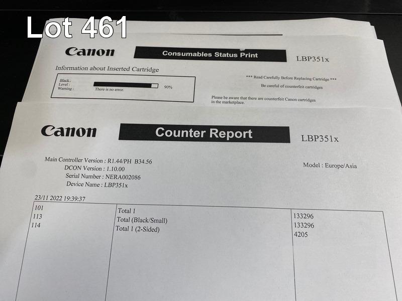 PRINTER, CANON imageCLASS LBP351x LASER, USB, NETWORK, 133,296 PAGES (TEST PAGE ATTACHED) WITH ADDITIONAL PAPER TRAY S/N:NERA002086