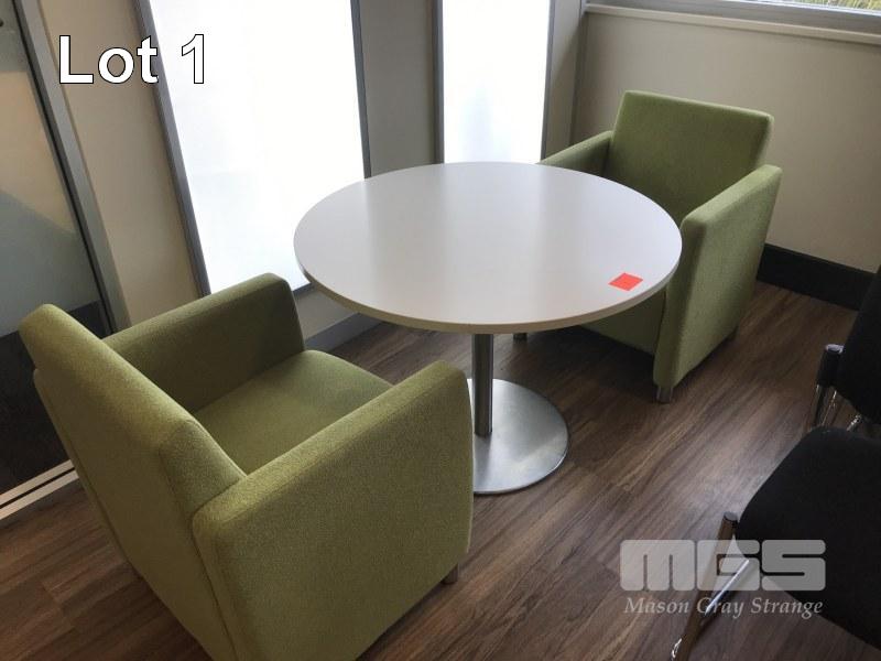VISITORS SETTING, 3 PIECE, CIRCULAR TABLE, WHITE LAMINATE WITH CHROME SINGLE PEDESTAL BASE PAIR OF GREEN FABRIC UPHOLSTERED ARMCHAIRS